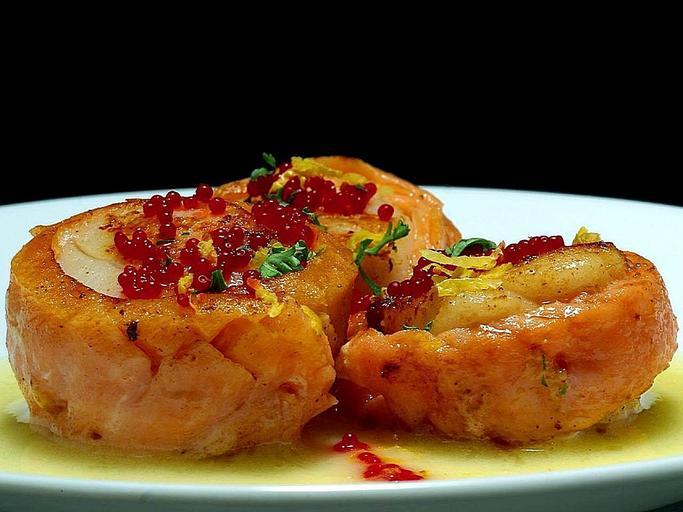 Keywords: caviar blanc beurre scallops wrapped salmon drink food