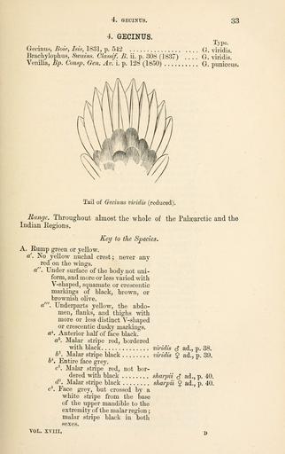 | Keywords: CBBM18 033.png Gecinus viridis <small> Linn </small> Picus viridis viridis <small>Linnaeus 1758</small> en Eurasian Green Woodpecker tail from dorsal Catalogue of the birds in the British Museum http //www archive org/details/catalogueofbirds18brit Vol 18 Page 33 1890 Peter Smit artist Edward Hargitt text PD-old CBBM18 Picus viridis illustrations Picus viridis anatomy bird tails |