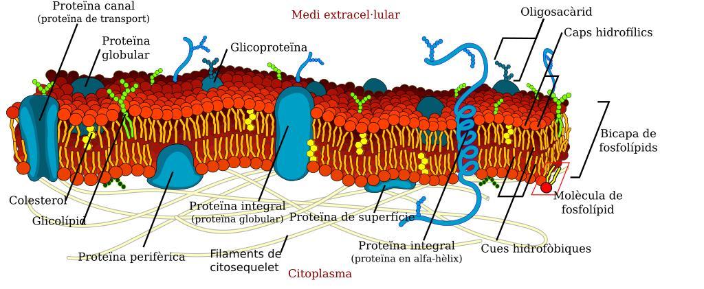 | Keywords: Cell membrane detailed diagram ca.svg La membrana cel·lular o membrana plasmàtica comuna a tots els éssers vius és una bicapa lipídica semipermeable A més dels lípids conté altres molècules com proteïnes implicades a una gran varietat de processos cel·lulars És també el punt d'ancoratge del citoesquelet cel·lular i si n'hi ha de la paret cel·lular Traducció de Cell_membrane_detailed_diagram svg 2007-05-09 LadyofHats traducció User imartin6 LadyofHats Other versions/Cell membrane detailed diagram translation possible SVG biology diagrams in Catalan Cell membrane Ultrastructure diagrams Semipermeable membrane |
