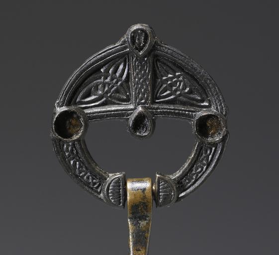 Keywords: Celtic - Ring Brooch - Walters 542342 - Detail.jpg This pin has decorative interlace panels and tri-lobed knots cast on its annular circular ring Tri-lobed knots are often found in Irish illuminated manuscripts of the period where they are a symbol of the Trinity Amber or glass paste studs once filled the now-empty circular hollows This pin was found at Ballinderry Crannog once the fortified lake dwelling of a local Irish king century 9 Medieval bronze formerly set with stones or glass pastes cm 9 8 2 7 0 8 accession number 54 2342 29094 Robert Day Cork date and mode of acquisition unknown Robert Day Sale Sotheby Wilkinson Hodge London May 19-22 1913 no 384 William Randolph Hearst Joseph Brummer Paris Joseph Brummer Sale Parke-Bernet Galleries New York May 11-14 1949 no 277 Walters Art Museum 1949 by purchase Museum purchase 1949 Early Christian and Byzantine Art Baltimore Museum of Art Baltimore 1947 Medieval Art Philbrook Museum of Art Tulsa 1965 Jewelry - Ancient to Modern The Walters Art Gallery Baltimore 1979-1980 place of origin Ireland Walters Art Museum license Medieval metalwork in the Walters Art Museum Jewellery in the Walters Art Museum Penannular brooches Celtic art |