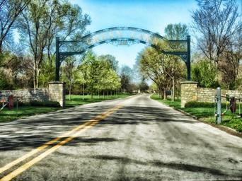 Keywords: cemetery entrance gate arch trees columbus ohio road nature outside hdr