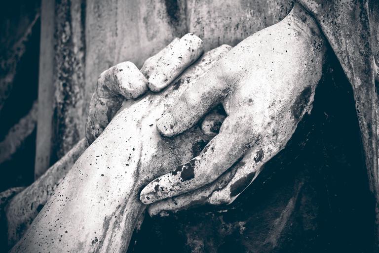 Keywords: cemetery grave tombstone fig tomb figure sculpture statue stone figure rock carving death rest stone angel figure faith mourning memory silent stone figures loneliness engrossment transience hand detail close up mystical tomb black white black and white close