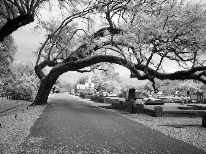 Keywords: cemetery magnolia cemetery mobile alabama usa united states america north america magnolia infra red sw black and white tree silent carol m highsmith harmony away grave mourning tombstone resting place transience death