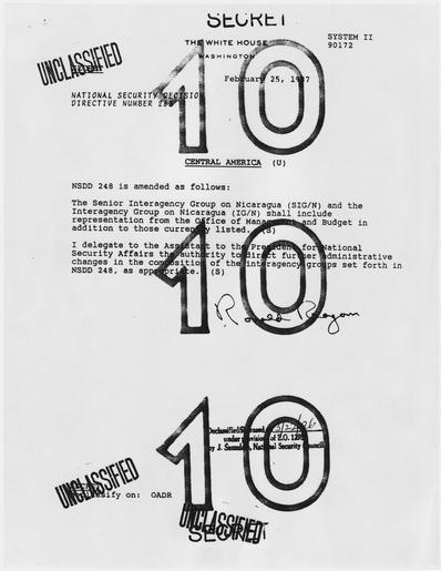| Keywords: Central America - NARA - 198362.tif Scope and content General notes 198362 Local identifier President 1981-1989 Reagan National Security Council 1981 - 1989 Ronald Reagan Library NLRR 40 Presidential Drive Simi Valley CA 93065-0600 1987-02-25 Record group Collection RR-NSC Numbered National Security Policy Papers 1981 - 1989 Record group ARC 1189 National Security Decision Directives compiled 02/25/1981 - 01/19/1989 Series ARC 198166 File unit File unit ARC Variant control numbers NAIL Control Number NLS-NSC-NSDD-263 yes Other versions <gallery> File Central_America_-_NARA_-_198362 tif tif File Central_America_-_NARA_-_198362 jpg jpg </gallery> NARA-cooperation PD-USGov Presidential Decision Directives Reagan NARA TIF images with categorized JPGs |