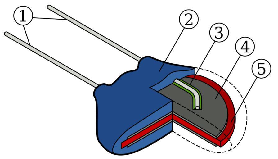 | Keywords: Ceramic Disc Capaictor.svg ceramic disc capacitor See below for a key own Inductiveload 2008-11-19 Key 'prettytable' English - 1 Leads - 2 Dipped phenolic coating - 3 Soldered connection - 4 Silver electrode - 5 Ceramic dielectric Ceramic capacitors Cutaway diagrams |