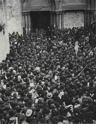 Keywords: Ceremony of the Holy Fire at the Holy Sepulchre (1905).jpg en Ceremony Of The 'Holy Fire' 1905 Greek Orthodox pilgrims at the entrance to the Church of the Holy Sepulchre awaiting the commencement of the Holy Fire ceremony The Turkish soldiers visible in the photograph attempt to maintain order pl Ceremonia Ognia Świętego Prawosławni pielgrzymi przed wejściem do bazyliki Grobu Świętego Rok 1905 http //www eretzyisroel org/~dhershkowitz/pic205 jpg author 1905 Holy Fire Historical images of Holy Sepulchre PD-old |