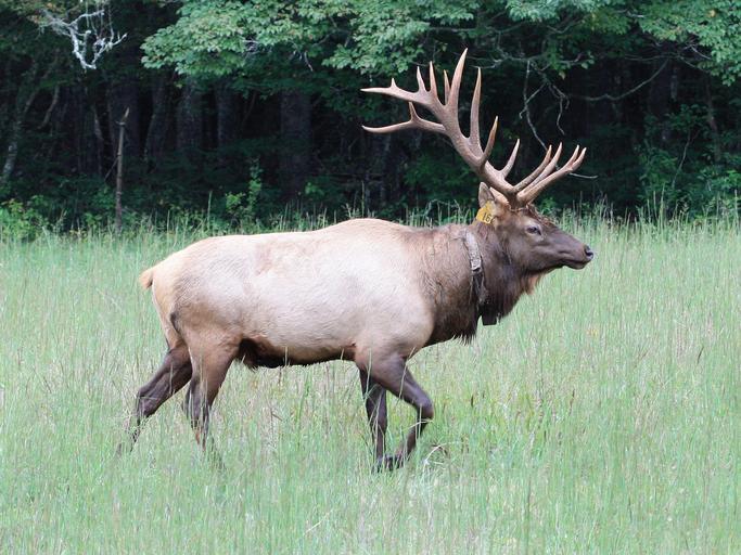 Keywords: Cervus canadensis Kaldari 01.jpg en A bull elk Cervus canadensis in the Cataloochee Valley of the Great Smoky Mountains National Park in North Carolina This elk is part of a herd which was transplanted to Cataloochee in 2001 own Kaldari 2009-09-13 Cervus canadensis male Animals of Great Smoky Mountains National Park Cataloochee Great Smoky Mountains Side views of animals |