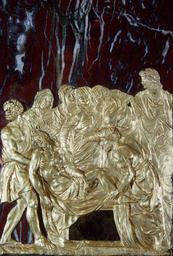 | Keywords: Cesare Targone - Appliqué with the Entombment - Walters 57564.jpg  Made from a paper-thin sheet of gold this appliqué to be applied to another surface such as marble or jasper is executed in repoussé pressed out from the back It is a virtuoso piece by Cesare Targone a goldsmith born in Venice who was active primarily in Rome and Florence during the late 16th century This precious work may have been executed while Targone was in Rome which would explain why it is stylistically close to the art of Guglielmo della Porta The use of gold indicates that the artist and patron wanted a relief of the utmost sumptuousness and delicacy Pure gold is rarely used because it is very soft making it impractical for objects that sustain pressure; indeed the faces of some of the women have been slightly flattened ca 1580 Renaissance gold on jasper mount with slate backing cm 18 5 17 accession number 57 564 6831 Henry Walters Baltimore date and mode of acquisition unknown Walters Art Museum Henry Walters Acquired by Henry Walters World of Wonder The Walters Art Gallery Baltimore 1971-1972 place of origin Florence Italy Walters Art Museum license Renaissance applied arts in the Walters Art Museum Plaquettes Cesare Targone Media contributed by the Walters Art Museum needs category review |