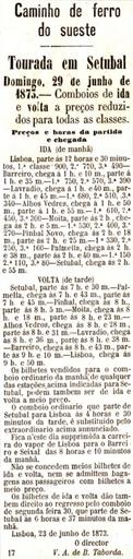 | Keywords: CFS Setubal bullfighting advertisement 3.jpg  pt Anúncio do Caminho de Ferro do Sueste em Portugal para comboios especiais a preços reduzidos de Lisboa via fluvial até ao Barreiro até Setúbal para uma tourada Esta imagem foi publicada no Diario Illustrado n º 335 de 27 de Junho de 1873 e digitalizada pela Biblioteca Nacional de Portugal en Advertisement of the Caminho de Ferro do Sueste Portuguese Southeastern Railway for special trains at reduced prices from Lisbon boats to Barreiro to Setúbal for a bullfighting event This image was published on the Diario Illustrado newspaper No 335 of 27th June 1873 and scanned by the Biblioteca Nacional de Portugal 1873-06-23 http //purl pt/14328/1/j-1244-g_1873-06-27/j-1244-g_1873-06-27_item2/j-1244-g_1873-06-27_PDF/j-1244-g_1873-06-27_PDF_24-C-R0150/j-1244-g_1873-06-27_0000_1-4_t24-C-R0150 pdf Caminho de Ferro do Sueste Institution Institution Biblioteca Nacional de Portugal other versions Custom license marker 2015 11 23 Anonymous-EU Public transport information in Portugal Caminho de Ferro do Sueste 1873 in rail transport in Portugal Ferries in Lisbon Linha do Alentejo Linha do Sul Images from the Biblioteca Nacional de Portugal |
