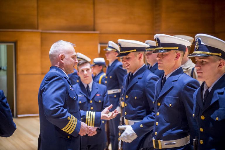 MAKE A MEME View Large Image Coast Guard Academy cadets and Officer Candidates perform a drill down in Leamy Hall at the Coast Guard Academy in New London, Conn., Feb. 11, 2016. A drill down is a competition in which military knowledge, precision and poise are judged. ...