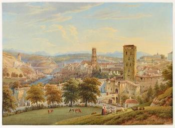 Keywords: CH-NB - Fribourg, Gesamtansicht, von Norden - Collection Gugelmann - GS-GUGE-LORY-A-5.tif Information Fribourg Gesamtansicht von Norden; Ansicht der Stadt Freiburg von Norden Im Vordergrund eine Weide wo eine Hirtenfamilie Schafe und Kühe hütet Rechts das Murtentor mit den alten Befestigungen Im Mittelgrund des Bildes das Kollegium St Michel die Kathedrale St Nicolas der Bischöfliche Palast und die Altstadt à ber der Saane an linken Bildrand die grosse Hängebrücke am Eingang der Schlucht die Gottéron Brücke Auf den Hügeln um die Stadt die alten Befestigungstürme im Hintergrund die Loreto Kapelle und die Greyerzer Alpen ; Fribourg; Aquarell Swiss National Library CH-NB-Collection Gugelmann PD-old-100 User Swiss National Library/Attribution-Recommendation GS-GUGE-LORY-A-5 http //www helveticarchives ch/detail aspx ID 480020 helveticarchives ch; Swiss National Library Prints and Drawings Department Uploaded with GWToolset CH-NB - Fribourg Gesamtansicht von Norden - Collection Gugelmann - GS-GUGE-LORY-A-5 http //upload-glam wikimedia ch/Gugelmann/GS-GUGE-LORY-A-5 tif Collection Gugelmann Media contributed by the Swiss National Library Gabriel Lory fils Historical images of Fribourg 1841 paintings 1841 in Switzerland Town walls of Fribourg |