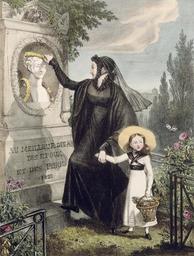 Keywords: Chalon - The Cemetery of Pere Lachaise 02.jpg after Woman in deep mourning clothes all-black placing a wreath on her husband's tomb memorial accompanied by a young girl mostly in white From <br> Twenty-four Subjects exhibiting the Costume of Paris the incidents take from nature Rodwell and Martin 1822 24 lithographies pet in-4 imprimées par Hulmandell et coloriées montrent La Dame du Café La Marchande de tisane La petite Fruitière Les Tondeuses de chiens Les Bonnes Le Café Les Brodeuses L'Escamoteur La Porte cochère Le Journal des Débats Le Restaurant La Loueuse de chaises La Marchande de brioches Une Matinée aux Tuileries Le Porteur d'eau Le Marché aux fleurs Le petit Décrotteur La Prise de tabac Les Adieux Les Dames de la Halle Le Cimetière du Père-Lachaise La Charrette du Blanchisseur Les Dames artistes La Marchande de modes 1822 engraving color private collection cite book Henri Beraldi Les graveurs du XIX e siècle guide de l'amateur d'estampes modernes 1885 232 http //wwww archive org/stream/lesgraveursdu19e12berauoft page/232/mode/2up British Museum 1853 0813 3 3347116 object history exhibition history credit line accession number 115403 thumb left Black and white PD-old-100 John James Chalon Paintings of the Père-Lachaise Cemetery 1822 paintings 1822 in Paris Père-Lachaise Cemetery in the 19th century Mourning women in art Mourning clothing Rodwell Martin |