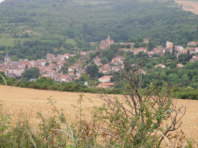 | Keywords: Champeix Vue générale11.JPG fr Champeix comm du Puy-de-Dôme France région Auvergne Vue générale du bourg depuis les hauteurs de Beauregard Au centre se dressant sur son promontoire rocheux le château du Marchidial avec ses murailles et sa chapelle castrale Saint-Jean clocher circulaire et campanile En contrebas près du bord latéral gauche de la photo église paroissiale Sainte-Croix Un peu en-dessous de cette dernière on distingue le pont de la Vernoze surplombant les eaux de la rivière Couze de Chambon Nous regardons vers le sud-sud-est 2011-07-07 own Torsade de Pointes cc-zero Uploaded with UploadWizard Champeix |