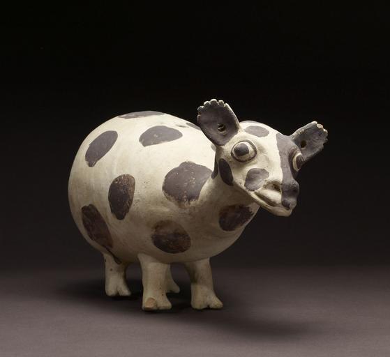Keywords: Chancay - Llama Effigy - Walters 20092049 - Three Quarter Front.jpg The llama a native camelid of the Americas touched all aspects of Andean life The llama- the only native American beast of burden-was used primarily to transport goods from the coastal deserts to the highest mountain plains Well adapted to the extremes of the Andean environment including climate terrain and altitude the llama was at the heart of every Andean home The llama and its camelid cousins alpaca guanaco and vicuña provided the all-important hairs that were spun into fibers to weave warm garments of considerable strength and durability Such clothing was crucial for survival during cold Andean nights and in the altiplano highlands Llamas also provided body heat for shepherds and other laborers who could not return to a warm home every night Llama blood was an important ritual offering and its meat was occasionally consumed for protein although the high value of the living animal made these latter uses infrequent and of special significance During the Late Intermediate Period the Chancay Valley and adjacent Chillón Drainage developed an energetic corporate style of architecture and art Large amounts of ceramics were produced and distributed among the ruling elite as well as those of lesser status Among these are the distinctive mold-made and hand-modeled sculptures of humans both men and women and animals This engaging sculpture of a young llama captures the animal's natural inquisitiveness It cocks its head slightly to the side as if watching intently some unseen activity The artist divided the llama's face into two halves painting one side white and the other black following the Andean principle of duality and balance The artist also designated the animal's sex as male and embellished the body with black spots one of the natural coloration schemes of the animal Typical of the distinctive Chancay pottery style is the somewhat haphazard modeling and painting which enhance the piece's charm AD 1000-1470 Late Intermediate earthenware slip paint cm 21 11 40 39 16 accession number 2009 20 49 80204 Economos Works of Art date and mode of acquisition unknown John G Bourne 1990s by purchase Walters Art Museum Gift of John Bourne 2009 place of origin Central Coast Walters Art Museum license Pre-Columbian art in the Walters Art Museum Chancay pottery Llamas in art Animals in Pre-Columbian art |