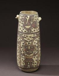 | Keywords: Chancay - Vessel - Walters 20092035.jpg The Chancay art style dominated Peru's Central Coast during the Late Intermediate Period although there was no centralized overarching state authority ruling the region Textiles and pottery were the primary artistic media the former being among the most colorful visually complex and technically excellent weavings ever produced in Peru Chancay pottery on the other hand is often rather casually or carelessly painted its slip characterized by a matte surface finish and a palette restricted to white and black with the infrequent addition of red or beige The low-fired Chancay ceramics make them susceptible to surface damage unlike the earlier pottery of the Moche Nasca and Waricultures On the other hand Chancay painting can be as lively as that of any Andean tradition The acute difference in quality between Chancay ceramics and textiles reflects sociopolitical divisions in Chancay culture Burial patterns indicate that the painted ceramics were consumed by all levels of Chancay society whereas fine textiles and precious metal objects were restricted to members of higher status As elsewhere in the Andean world artistic quality and materials conveyed messages of hierarchy and power This tall narrow vessel features the frontal rendering of a male figure He grasps a puma-headed staff in each hand and two serpent-headed rays emanate from his head These pan-Andean features link the figure to traditional depictions of supernatural beings or deities and shamans The bird painted at the top of the vessel reflects this theme in its crescent-shaped head adornment which distinguishes the Sicán Deity or Sicán Lord who may be a culture hero or a deity among cultures to the north The Sicán Lord is associated primarily with the Sicán and later Chimú societies of the North Coast although the Chimú extended their influence over the Chancay people at the end of the Late Intermediate Period It is not improbable that this symbol of divinity and/or sacred ancestry was adopted by the Chancay The painter of this tall vessel animated the scene by filling the background with black avian footprints which at the least lend motion to the bird if not implying its ritual performance AD 1000-1470 Late Intermediate earthenware slip paint cm 29 69 12 19 accession number 2009 20 35 80190 Economos Works of Art date and mode of acquisition unknown John G Bourne 1990s by purchase Walters Art Museum Gift of John Bourne 2009 place of origin Central Coast Walters Art Museum license Pre-Columbian art in the Walters Art Museum Chancay pottery Media contributed by the Walters Art Museum needs category review Lambayeque pottery Staff God |