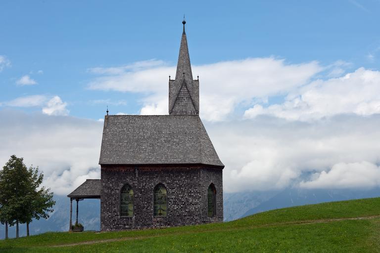 Keywords: chapel mountain church timber shingle cladding spire meadow clouds tranquility christianity windeck tulfererberg austria