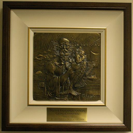 Keywords: Chapkanov-St-Nicholas.jpg Metal icon of St Nicholas by the Bulgarian artist Georgi 'Chapa' Chapkanov The premises of the Falklands Legislative Council at Gilbert House in Stanley Falkland Islands As a patron saint of fishermen the Saint is uniquely depicted holding a fish fishing being the mainstay of Falklands economy The icon's inscription reads To the Falklands Nation / Georgi Chapkanov / March 2003 / By appointment of Dr Lyubomir Ivanov Own 2008-01 Apcbg Image Chapkanov-Saint-Nicholas jpg Reliefs of Saint Nicholas |