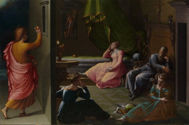| Keywords: Charity of St Nicholas by G.Macchietti (1555-60, Nat.Gall.).jpg The Charity of St Nicholas of Bari about 1555-60 Girolamo Macchietti National Gallery The story depicted in the panel is that of the 4th-century saint Nicholas of Myra Under cover of darkness Saint Nicholas throws three golden balls through the window of the house of an impoverished nobleman Golden balls were often used by artists to represent the purses of the gold mentioned in the saint ™s legend According to the legend the nobleman had been faced with the prospect of selling his girls into prostitution The saint ™s act of charity saved them from this fate providing dowries for the three daughters who were duly married The story gradually evolved into the Christmas tradition of Santa Claus The shape and sturdy structure of the panel suggest that the picture may have been a 'spalliera' a decorative painting set into a piece of furniture or incorporated into the panelled walls of a camera a room that functioned as a bed-chamber and reception room The subject matter is well suited to such a purpose since the picture both depicts a bedchamber rather better furnished than the nobleman's straitened circumstances might suggest and evokes the theme of sleep in an inventive variety of poses https //www nationalgallery org uk/paintings/girolamo-macchietti-the-charity-of-st-nicholas-of-bari about 1555-60 Girolamo Macchietti Girolamo Macchietti Files uploaded by Shakko from various sources Saint Nicholas Throwing the Gold Bars to Three Poor Girls 16th-century paintings of Saint Nicholas PD-old |