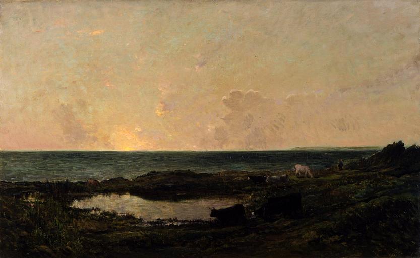 | Keywords: Charles François Daubigny - Sunset on the Coast at Villerville - Walters 3717.jpg Daubigny first visited Villerville in 1854 and returned each year thereafter He built a lean-to hut for shelter and is known to have painted at least one of his large- scale paintings of the coast entirely on the spot He wrote quote I look at the sea and it is so beautiful that I have no desire to go anywhere else I have seen sunsets that make those of the French Baroque painter Claude Lorrain seem very dull In this sunset view the range of colors in the sky from pinks to lilacs to yellows highlights Daubigny's ability as a colorist ca 1865 oil on canvas cm 93 4 150 5 accession number 37 17 25287 William T Walters Baltimore 1878-1884 mode of acquisition unknown Henry Walters city Baltimore Walters Art Museum Henry Walters Acquired by William T Walters between 1878 and 1884 Signature Lower right Daubigny; Date Lower right 65 The Works of Antoine-Louis Barye American Art Gallery New York New York 1889-1890 Before Monet Landscape Painting in France and Impressionist Masters Highlights from The Walters Collection The Walters Art Gallery Baltimore 1998 The Road to Impressionism Landscapes from Corot to Manet The Walters Art Museum Baltimore 2004-2005 place of origin Villerville place depicted Villerville Walters Art Museum license 2D Paintings by Charles-François Daubigny Villerville French paintings in the Walters Art Museum 1860s landscape paintings 1860s paintings from France 19th-century paintings |
