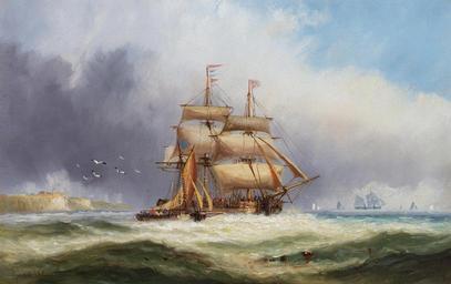 Keywords: Charles James De Lacy - The Isle of Wight Pilot Boat hailing an outward bound ship (1887).jpg Artwork Creator Charles James De Lacey 1887 oil on canvas cm 20 3 30 5 object history credit line 'C J de Lacy / 87 ~ lower right signature / date accession number http //www bonhams com/auctions/11998/lot/96/ Bonhams PD-old-auto-1923 1936 Charles John De Lacy Images from Bonhams 19th-century sailing ships in paintings |