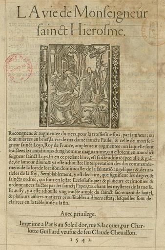 | Keywords: Charlotte Guillard 1541.jpg fr Première page de La Vie de monseigneur sainct Hierosme de Louis Lasseré Imprimé à Paris au Soleil d'Or rue Saint Jacques par Charlotte Guillard veufve de feu Claude Chevallon 1541 in-2° 1541 http //www bvh univ-tours fr/Consult/index asp numfiche 1041 Bibliothèque municipale d'Orléans Louis Lasseré auct Charlotte Guillard impr other versions Custom license marker 2014 11 20 PD-100 Uploaded with UploadWizard 1541 texts 1541 in France Rue Saint-Jacques Paris |