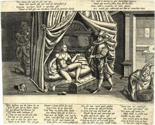Keywords: Chastity belt satire.jpg in German dialect <br/> Wer Eÿfferen wil der schaw hie an Wie es geht fast ein jedern Mann Ich sag für war füer Frawen list Uff Erden nichts verborgen ist Es hatt ein Mann ein Fräwlein schon Der hatt ein reis genommen an Die weil er aber ein eifferer war Macht er ein Bruch von eisen gar Darmitt er fromm behielt sein Weib Zog er das ihr an ihren Leÿb Und heing ein starckes schlos darfür Das niemand öffnen soltt die theür Nam aüch den schlüssel und zog hin Das Weib stach bald und eselt ihm Diweil ein alt Weÿb hinderm Bett Zum Schlos ein andern Schlüssell hett ---- Previously attributed to one of the members of the Wierix family The print is unsigned three copies cited by M -H An impression in Wolfenbüttel measures 19 4 x 23 7 cm and is signed This version is possibly a copy ---- A woman cheating on her husband; a naked woman with a chastity belt sits on a bed with her foot on a chest and offers a key to a finely attired man with fool's ears; two figures observe the scene from the shadows and a fool empties a sheet of lice into a basket; a satire ~ 1590 1523832 Creator Heinrich Wirrich For other Renaissance caricatures on the same general theme see File 16thc-German-woodcut-Chastity-belt jpg and File Alfons luder kunde gif PD-old-100 Female chastity devices Heinrich Wirrich Satire Female toplessness in art 16th-century cartoons Prints in the British Museum Caricatures of the Netherlands Jealousy in art Fools Topless women in bed in art Donkey's ears |