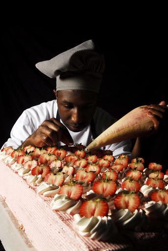 Keywords: chef food decorations icing bakery strawberries man male culinary cake cook cooking pastry bag hat
