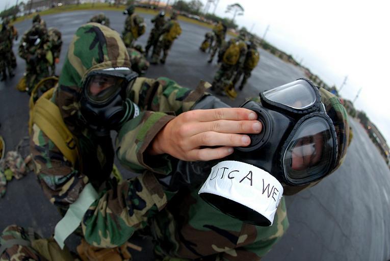 | Keywords: Chemical, Biological and Radiological Warfare Drill DVIDS124753.jpg en Apprentice Robert Weiss utilitiesman constructionman assigned to Naval Mobile Construction Battalion 1 holds his MCU-2P gas mask in place while a fellow Seabee tightens his overhood during a chemical biological and radiological warfare drill at Naval Construction Battalion Center Gulfport 2008-10-24 Petty Officer 1st Class Demetrius Kennon https //www dvidshub net/image/124753 081024-N-+++++-006 2008-10-27 20 13 GULFPORT MS US PD-USGov-Military-Navy M40 Field Protective Mask Images from DoD uploaded by Fæ |