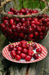 Keywords: cherries fruits sweet cherry cherry harvest fruit red garden summer basket plate