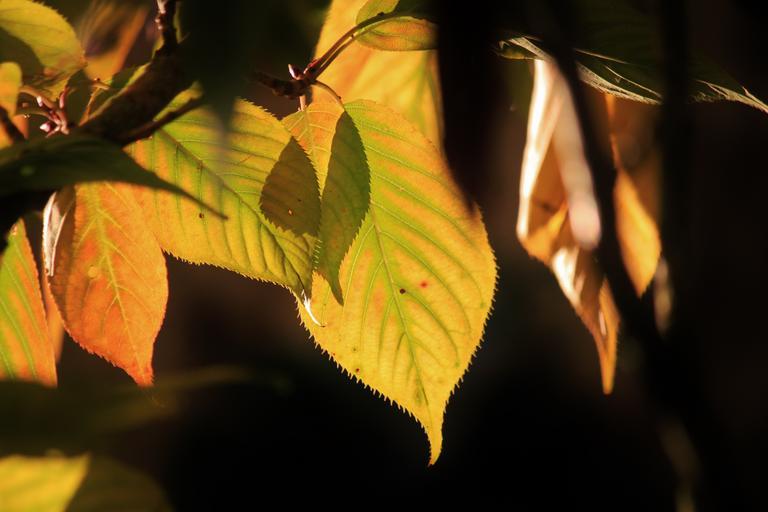Keywords: cherry fall foliage autumn colours colorful leaves autumn leaf colorful leaves color golden autumn leaves in the autumn flora yellow orange sunny branch plant nature discolored macro macro photography