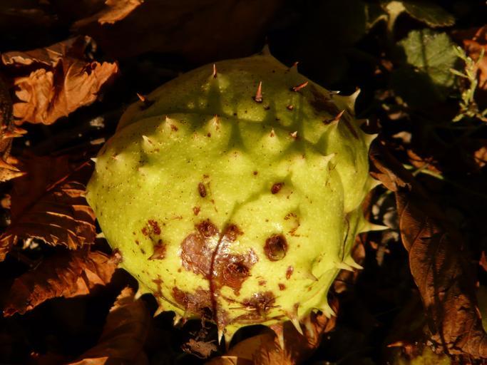 Keywords: chestnut buckeye fruit concerns ground collect autumn fruits brown shine toxic forest floor earth grass moss leaves shell prickly pieksig sleeve