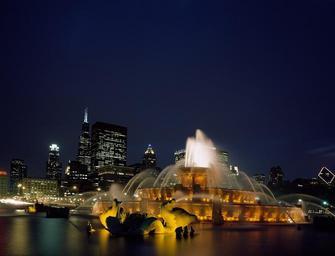 Keywords: chicago fountain cityscape skyline landmark evening dusk twilight night lights water architecture view urban tourism downtown scenic tourist reflection illinois usa