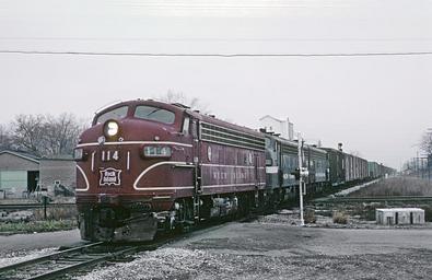 View Original:Chicago_Rock_Island_&_Pacific_114_(F7A)_with_New_York_Central_freight_at_North_Judson,_Ind._on_November_25,_1966.jpg (2000x1297)