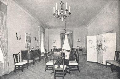 | Keywords: cmr embassy usa eeuu uruguay (1946) The main dining room admirably combines the Sheraton table with comfortable Chippendale chairs, ivory-colored upholsteries. The mahogany furniture harmonizes with pearl gray of the walls, giving a hint of color to the sumptuous gold-yellow window curtains. A screen etched with screens from a Colonial-era hunt, together with the black and silver Chinese-style Chippendale chandeliers; highlight the original layout of this magnificent overall decoration. Beige colored rug. English and North American silverware.  The residence of the U.S. Ambassador to Uruguay was completed and officially inaugurated in September, 1942.  (1946) En el gran comedor combinan admirablemente el aparador y la mesa Sheraton con las cómodas sillas Chippendale, tapizadas en cuero marfil. La caoba de los muebles armoniza con el gris perla de los muros, dando la nota de color los suntuosos cortinados, amarillo-dorados, de las ventanas. Biombo litografiado con motivos de caza de la época colonial, junto con la arañas Chippendale de tipo chinesco, negras y plateadas, constituyen un original detalle de la magnífica decoración general. Alfombra tono beige. Platería de precedencia inglesa y americana. La residencia del Embajador de los Estados Unidos en Uruguay se completó y fue oficialmente inaugurada en setiembre de 1942.  [Photo: Editorial Anales S.A. (1946)] (1946) The main dining room admirably combines the Sheraton table with comfortable Chippendale chairs, ivory-colored upholsteries. The mahogany furniture harmonizes with pearl gray of the walls, giving a hint of color to the sumptuous gold-yellow window curtains. A screen etched with screens from a Colonial-era hunt, together with the black and silver Chinese-style Chippendale chandeliers; highlight the original layout of this magnificent overall decoration. Beige colored rug. English and North American silverware.  The residence of the U.S. Ambassador to Uruguay was completed and officially inaugurated in September, 1942.  (1946) En el gran comedor combinan admirablemente el aparador y la mesa Sheraton con las cómodas sillas Chippendale, tapizadas en cuero marfil. La caoba de los muebles armoniza con el gris perla de los muros, dando la nota de color los suntuosos cortinados, amarillo-dorados, de las ventanas. Biombo litografiado con motivos de caza de la época colonial, junto con la arañas Chippendale de tipo chinesco, negras y plateadas, constituyen un original detalle de la magnífica decoración general. Alfombra tono beige. Platería de precedencia inglesa y americana. La residencia del Embajador de los Estados Unidos en Uruguay se completó y fue oficialmente inaugurada en setiembre de 1942.  [Photo: Editorial Anales S.A. (1946)]  |