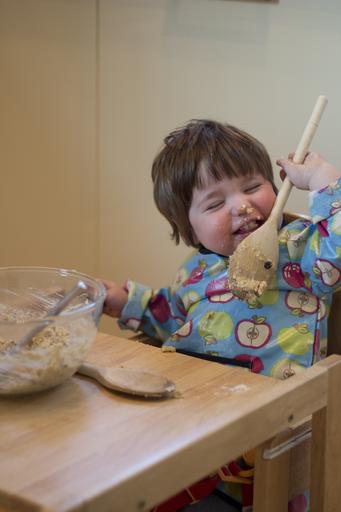 Keywords: child cake making licking spoon fun young baby girl cake mix bake wooden spoon messy