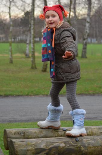 Keywords: child girl people winter clothing hat bones scarf balance