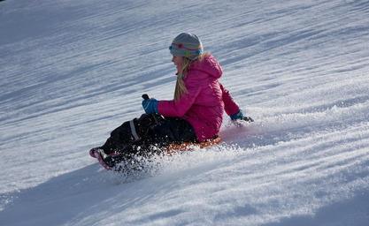 Keywords: child girl winter snow bob ride on slip downhill down fast fun joy winter fun nature out in motion in action