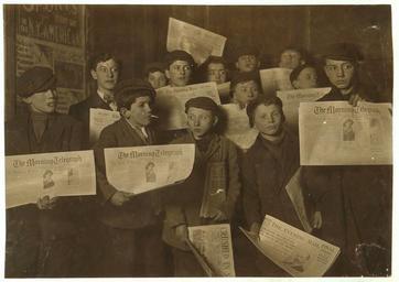 Keywords: child labor boys group newspaper press historic people children black and white sepia america