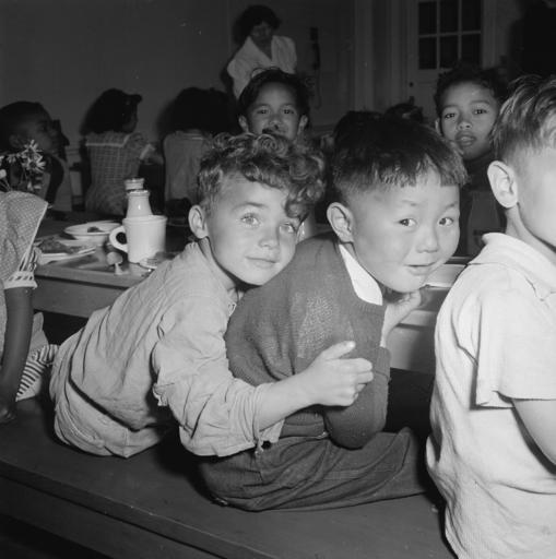 Keywords: children black and white 1920s boys girls education lunch tables food cute