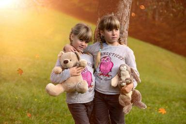 Keywords: children girl blond stuffed animals autumn evening lighting