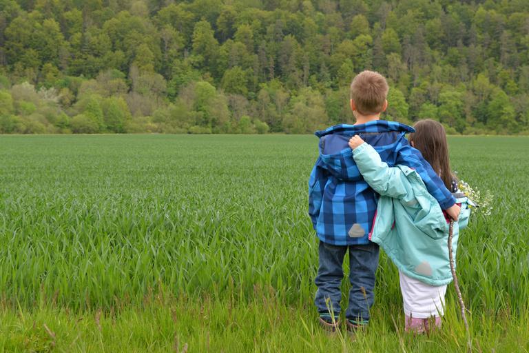 Keywords: children love friends hand flowers meadow forest walk family affection cute community joy young view rest silent blue jacket autumn boy girl best