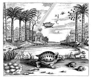 | Keywords: China-Illustrata-Winged-turtles-of-Henan.png en The winged turtles of Henan There is no caption under the picture but a text on the preceding page p 204 refers to Michael Boym's account in Flora Sinensis Chinese Flora about turtles with green wings attached to their legs which appears to be Boym's misinterpretation of the concept of green-haired turtles 绿毛龟 i e turtles with algae growing on them Kircher has this to say on this matter The Chinese Flora says that in the kingdom of Honan are found turtles which are green or blue and that there are also some with wings on their feet who in this way they compensate for the slow progress they can make on foot I however could not easily believe that these swimming creatures have wings for it seems to violate the primary nature of a turtle Rather turtles give off a sticky liquid around their feet as the drawing shows and in time this becomes cartilaginous and resembles a limb which flaps around as they move This is not used for flying so when the matter is examined it turns out to be different than is commonly believed These are the facts about the rarer animals found in China and we cannot cease to marvel at and praise God s admirable arrangements and His wisdom in all things P 207 in the modern http //hotgates stanford edu/Eyes/library/kircher pdf English translation by Dr Charles D Van Tuyl An http //digicoll library wisc edu/cgi-bin/DLDecArts/DLDecArts-idx type turn entity DLDecArts Nieuhof p0461 id DLDecArts Nieuhof isize M early 1673 English translation of China Illustrata does not reproduce this picture but says this p 417 The Flora Sinensis says That there are found Tortoises in the Kingdom of Honan some green and some blue; there are also others that to mend their Pace have Wings added to their Feet ru К ылатые че епахи из Хэнани Flora Sinensis text images and French translation are http //webapps fundp ac be/moretus/flora_sinensis/index_flora_sinensis html available online ; Kircher re-tells the same account with more details China Illustrata p 205 Can be found e g at http //gallica bnf fr/ark /12148/btv1b20000389/f60 item An artist working for Athanasius Kircher - or maybe Kircher himself Published 1667 200px Boym's original picture of a green-winged turle in Flora Sinensis China Illustrata Turtles in art PD-old |
