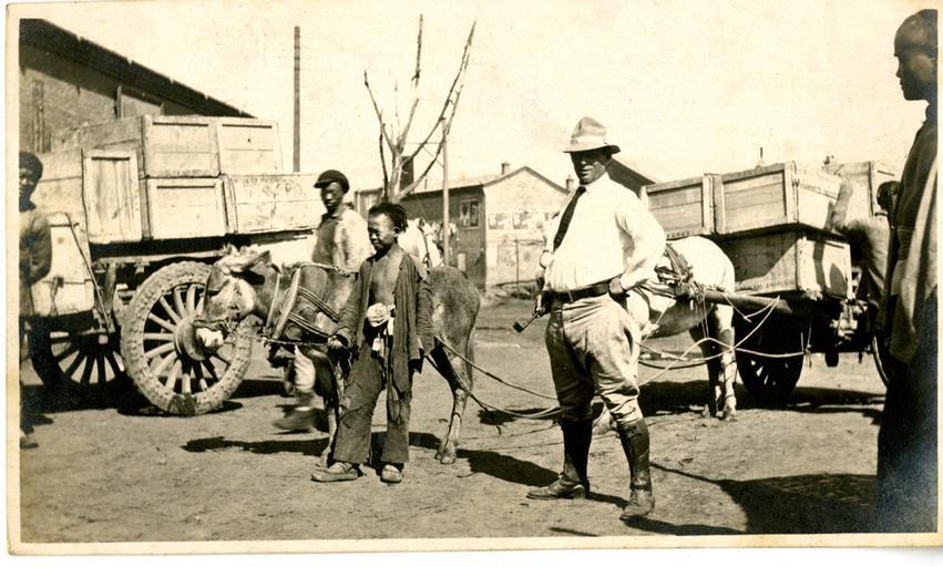View Original:China,_Miscellaneous_Scenes:_Expedition_participant_holding_a_pipe_with_Chinese_men_guiding_carts_loaded_with_crates.jpg (1024x616)