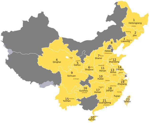 | Keywords: China provinces numbered.svg A SVG version of en File China provinces numbered png base on File China provinces numbered with regional colors svg Yellow - Provinces of the People's Republic of China Yellowish - Dispute province of Taiwan Since its founding in 1949 the People's Republic of China has considered Taiwan Province to be its 23rd province even though it has never controlled any part of Taiwan The Republic of China currently controls this area which consists of Taiwan island and the Pescadores The ROC also controls one county of Fujian or Fukien province Jinmen Kinmen ; and part of a second county Lienchiang Dark Gray - Other Province level-divisions Autonomous regions Municipalities and Special Administrative Regions Gray - Disputed territories own 2009-07 en User ASDFGH Language-neutral maps of China Administrative maps of China SVG language-neutral maps SVG maps of China Maps numbering |