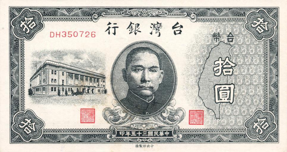 | Keywords: ChinaTaiwanP1937-10Yuan-1946 f.jpg en 10 Old Taiwan dollars These notes must be distinguished from the one's the Japanese Taiwan Ginkō issued under the same English name 1899-1945 es 10 dólares antiguos Ron Wise's World Paper Money http //aes iupui edu/rwise Bank of Taiwan 1946 PD-Old GFDL cc-by-3 0 1946 banknotes Banknotes of Taiwan Bank of Taiwan Banknotes with a face value of 10 Grey banknotes | ||||