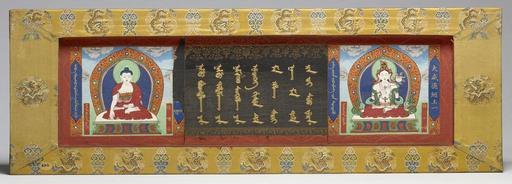 | Keywords: Chinese - Mandala with the Buddha and Bodhisattvas - Walters 3592.jpg In the center of this piece is an inscription in Pali Each figure has an inscription in Chinese and another language with larger side panels the same The Chinese inscription to the right of the Buddha as been torn off The piece is in a wood frame covered in brocade century 18 wash colors on paper mounted on panel with wood frame covered with brocade H 9 5/8 x L 29 in 24 5 x 73 7 cm accession number 35 92 30310 Henry Walters Baltimore date and mode of acquisition unknown Walters Art Museum Henry Walters Acquired by Henry Walters Inscription In center in Pali ; Inscription With each figure in Chinese and another language; Inscription On larger side panels in Chinese and another language; Inscription On back in pencil From Yellow Temple near Peking Ch'ien Lung place of origin Tibet Walters Art Museum license Tibetan art in the Walters Art Museum Buddhist art of Mongolia Media contributed by the Walters Art Museum needs artist review Buddha Tara |