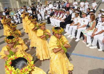 | Keywords: Chinese ships visit Pearl Harbor-Hickam 130906-N-ZK021-008.jpg en U S and Chinese leaders watch as Keiki Hula dancers perform during an arrival ceremony for three People's Liberation Army-Navy ships Luhu-class destroyer Qingdao DDG 113 Jiangkai-class frigate Linyi FFG 547 and a Fuqing-class fleet oiler as they arrive in Hawaii for a scheduled port visit Over the weekend Chinese and U S leaders will conduct dialogues to build confidence and mutual understanding between the two nations The port visit is part of the U S Navy's ongoing effort to maximize opportunities for developing relationships with foreign navies to build trust encourage multilateral cooperation enhance transparency and avoid miscalculation in the Pacific U S Navy photo by Mass Communication Specialist 2nd Class Nardel Gervacio/Released 2013-09-06 Petty Officer 2nd Class Nardel Gervacio https //www dvidshub net/image/1011910 130906-N-ZK021-008 2013-09-06 22 57 JOINT BASE PEARL HARBOR-HICKAM HI US PD-USGov-Military-Navy 2013 in Pearl Harbor People at Joint Base Pearl Harbor-Hickam Images from DoD uploaded by Fæ |