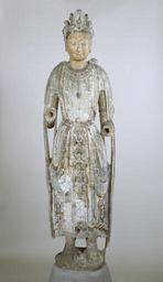 Keywords: Chinese - Standing Bodhisattva - Walters 254.jpg Bodhisattvas or Buddhas-to-be are dressed as Indian princes would be with elaborate jewelry Although his identifying symbols are lost this Bodhisattva is probably Guanyin Kuan-yin one of two Bodhisattva attendants to the Buddha who dwells in the western paradise The most important of all Bodhisattvas Guanyin Kuan-yin responds to the needs of those who call upon him- to escape from a fire or when desiring the birth of a child He usually holds a lotus sometimes in a vase in his lowered left hand sometimes in his right hand - a symbol of transcendence because it rises from mud The head of this statue was probably re-carved in the 11th-12th century or later between 581 618 quartz sandstone traces of paint cm 194 3 accession number 25 4 15294 Yamanaka Co New York Henry Walters Baltimore date of acquisition unknown by purchase Walters Art Museum Henry Walters Acquired by Henry Walters place of origin Shanxi Shan-hsi China Walters Art Museum license Art of China in the Walters Art Museum Media contributed by the Walters Art Museum needs category review Bodhisattva statues from China Statues of the Sui Dynasty |