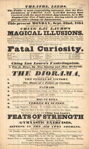 Keywords: Ching Lau Lauro 1834.jpg Theatre Leeds West Yorkshire poster of Monday 22 September 1834 advertising the magician Ching Lau Lauro http //www leodis net/playbills/images/lge/2003618_51241702 jpg 1834-09-22 Anon PD-old-70-1923 Ching Lau Lauro Playbills of the United Kingdom The Theatre Leeds Aerial suspension illusion |