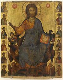 Keywords: Christ in glory with apostles (14th c., Constantinople).jpg Ο Χριστός εν δόξη και οι δώδεκα Α όστολοι μέσα 14ου αιώνα 78x96εκ άγνωστος ζωγράφος α ό την Κωνσταντινού ολη Εδόθη μοι άσα εξουσία εν ουρανώ και ε ί της γης Πορευθέντες μαθητεύσατε άντα τα έθνη ατθ 28 18-19 κείμενο στο ευαγγέλιο ου κρατάει ο Χριστός Ο Χριστός εικονίζεται καθισμένος σε θρόνο α ό σεραφείμ ευλογεί με το δεξί του χέρι και κρατάει ανοιγμένο ευαγγέλιο με το αριστερό Περιβάλλεται α ό τα σύμβολα των ευαγγελιστών και α ό τους δώδεκα α οστόλους οι ο οίοι αριστάνονται σε ροτομή και βρίσκονται σε δύο στενές στήλες δεξιά και αριστερά του http //eib xanthi ilsp gr/gr/icons asp cursort iconTitle selectFieldValue vpage 3 mid 14th century Constantinople master PD-old Files uploaded by Shakko from various sources 14th-century icons of Byzantine Empire Icons of Christ Pantocrator enthroned Icons of apostles Icons with saints on the margins |